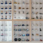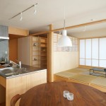 子世帯側の出窓スペースは奥行きを延長することで、小上がり畳とつながる縁側として、また物干しのためのサンルームとしても機能させている。若夫婦の仕事場としてのワークスペースはリビング側に趣味のフィギュアを並べるコーナーを設けた。