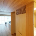 温度のバリアフリー化を達成するため、二例目となるエアコン1台での全室冷暖房を採用。天井裏エアコンは天井高を抑えた共有廊下に設置、冷房は上から、暖房は床下から吹き出せるようにしている。