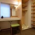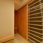 これまで関東で二件設置した全室空調を関西ではじめて採用、天井裏に設けたダクト形エアコンからは暖房を二重床の床下空間に、冷房は各所天井のガラリから落とせるようにして、エアコン一台での全室冷暖房を実現している。全周の吹付断熱による断熱付加、窓面の内窓とブラインド、障子の設置で断熱性能を向上させつつ、玄関には木製網戸を設けることで春や秋は自然の風通しを最大限活かせるように配慮している。