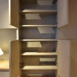 リビングと寝室を仕切る間仕切家具は天井を横断する梁と高さや色を呼応させつつ、上部を抜いてガラスを入れることでお互いの空間の広さを共有できるように考えた。この家具をはじめリビング窓上にはキャットウォークを設け、家具の一部に猫用の階段を収納のように同化させている。また居室に使われていた引違い窓を洗面と浴室で半分ずつ共有できる配置とし、採光と通風を両立させている。