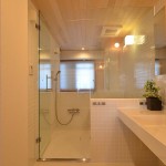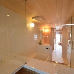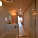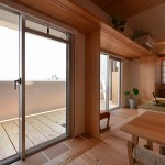 可動可能な小上がりユニットを18個敷き詰めたリビング、中央には4個の座卓ユニットを設けて大人数にも対応できる床座リビングに。L字ガラスで変形した南側開口には引き込める5枚引戸を設けて断熱強化とともに窓辺のサンルームを確保。物干しスペースとしても使えるように上部に収納可能な物干しフラップを設けている。ハーフユニットバスを用いた開口的な浴室は南北の窓をつなぐ風の通路にもなっている。