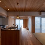 川崎市の緑あふれる住宅街に建つマンションを夫婦と小学生の子供二人の住まいとして計画。低層の壁式構造のため、住戸内に抜けない壁と梁が出てくるネガティブな要素をポジティブに捉え、梁と窓ラインでリビング全体に鴨居を通しつつ壁の仕上げを切り替え、ウッドデッキを設けた凹部のバルコニーまでを視覚的に室内に取り込めるよう考えた。