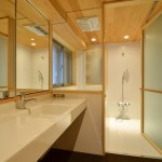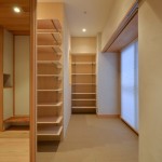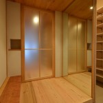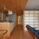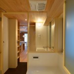 各開口部は、北側の掃き出し窓は土間空間に繋ぎ、出窓はハーフユニットバスを使った浴室の窓として生かし、浴室と土間の間に開口部を設けることで、ダイニング、キッチンを通して水周りまで住戸南北を貫く風と人の動線を確保して通風と採光を確保している。寝室は北側に小上がり和室として設け、子供室はリビングの可動本棚で区切られた一角に設置、将来的には撤去して大空間のLDKに戻せるようにしている。