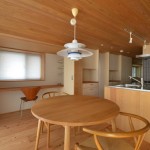 リビング南北の梁はダイニングキッチンの天井高を2mでフラットに抑えることで凹凸を消し、もともとあったキッチンの勝手口は食器棚の一部としてなじませ、出窓部にはワークカウンターを設けた。南側の開口部は障子と板戸を組み合わせた6枚引戸で線を揃えて水平ラインで重心を落としてある。