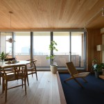 正方形に近い住戸形状の南側はウールカーペットで一段下げたリビングとダイニング、キッチンは高層ビルの夜景を切り取る窓に面して配置。ハイサッシに杉板の天井高を合わせて視線を誘導する。