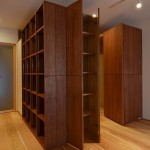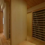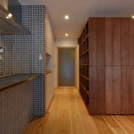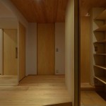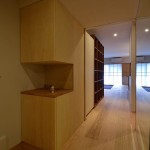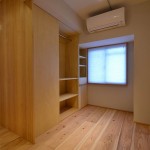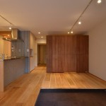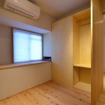 大阪市都島区、敷地内に公園や緑も多い大規模団地の中の一棟のマンションリノベーション。大人二人がそれぞれ個室を確保しつつ、収納量や使い勝手も加味した空間として設計。階段室型で玄関が東面中央、南北両面に居室が取れる住戸形状を活かし、南側に居間やキッチン、北側にそれぞれの居室は隣り合わせて配置。浴室はもともと居室にあった小窓を採光窓として取り入れたハーフユニットバスとして、キッチンは洗面スペースやパントリーと回遊できる動線を確保。リビングに設けたウォークインクローゼットを箱状に入れ子構造で入れ込むことで圧迫感を解消、リビングには一段下がったカーペットスペースに障子、出窓には籐を用いた簾戸(すど)を設けた。