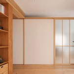 LDKは専用庭に面した南側にリビング、そこから玄関へのサブ動線上にキッチンを二型に設けている。北側玄関からは左斜めに走る板壁のメイン動線にトイレと洗面、脱衣室のみを隣接させた浴室があり、住戸東側を寝室、ウォークイン、将来家具で仕切ることで分割できる子供室を配置、廊下との間を6枚の引戸で仕切ることでライフスタイルの変化にフレキシブルに対応できるようにしている。
