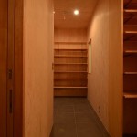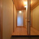玄関横にはヒノキ合板で壁天井を仕上げた趣味の自転車をメンテナンスする土間スペースを、バルコニーにはスノコ式の杉ウッドデッキを設けている。