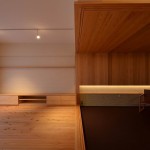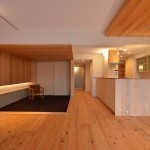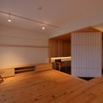 大阪狭山のため池のある風景を一望できる高台のマンションの一室をリノベーション。リビングに設けた小下がりカーペットの寝室空間は杉材のボックスとして、天井裏には収納を、夜は障子を閉め切れるよう回転障子としている。
