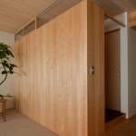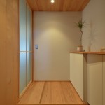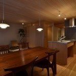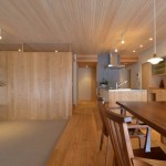リビング天井にヒノキの小幅板風羽目板を使い、南側窓には引込障子を設け、凸型の一部を室内物干しができるサンルームとしている。リビングは一段下げたウールカーペット敷とし、洗面やトイレは上部を建具で抜いた収納壁で隠すことで解放感を保ちつつプライバシーも確保できる計画としている。