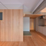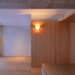 リビング側に飛び出す浴室を板張りで上部をミラー貼りとすることで箱として表現、また住戸内を走る梁をあえてそのままとし、廊下天井をぐっと下げたデザインとして水周りを含めた入れ子として空間全体の圧迫感を消している。