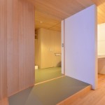 どうしても生まれる水周りの段差はリノリウムを貼った置き型のスロープで解決、また玄関の手すりもニッチや側板の溝加工で処理することで、車いすでの生活をなるべくインテリアにすっとなじませることができたと思う。