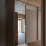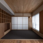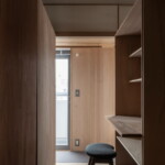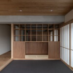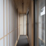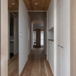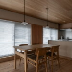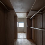 西面窓際にサンルームを設け、障子で仕切ることで熱のバッファゾーンとしつつ、物干しや通路として使えるようにした。サンルームの天井は低く抑え、上部を天袋収納とし、エアコン設置スペースとしても活用している。