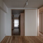 まず、もとから住戸中央にあった水周りを中心に、正方形住戸を『井』の字のように9分割し、窓際にリビングやダイニング、寝室、子供室といった居室を配置、窓のない場所に水周りや収納を設け、引戸や可動家具で仕切られるようにすることでそれぞれ最適な場所に配置し直すこととした。