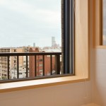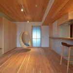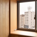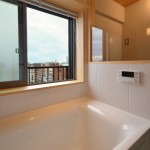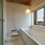 大阪市内、玉造でのマンションリノベーション。既存は玄関側に洋室二室と和室にLDKという典型的な間取り。角部屋で南に面している2つの出窓と腰窓は荷物置場となり活かされていなかった。開放的で明るい浴室とワンルームのような空間が欲しいというクライアントの要望に、南向きの窓を浴室のために使いつつ、リビングと天井を繋ぐことで明るさも共有するというプランを提案した。