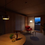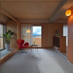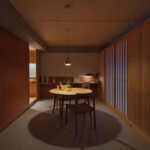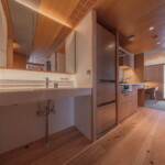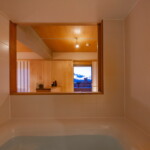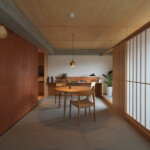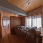 物件はJR郡山駅からほど近い、5か所ある掃き出し窓から会津の山並みを遠く望みつつ、郡山の街を一望できる絶好のロケーションを持つ正方形に近いコンパクトな角部屋。そこに対し、住戸のコアに浴室を設け、断熱改修を施した壁と窓の内側に障子と板戸の結界を取り回し、長く取った土間空間や縁側、水周り空間を配置しながら少しずつ切り取っていくことで居場所と役割を与えていくような構成としている。