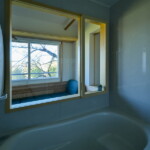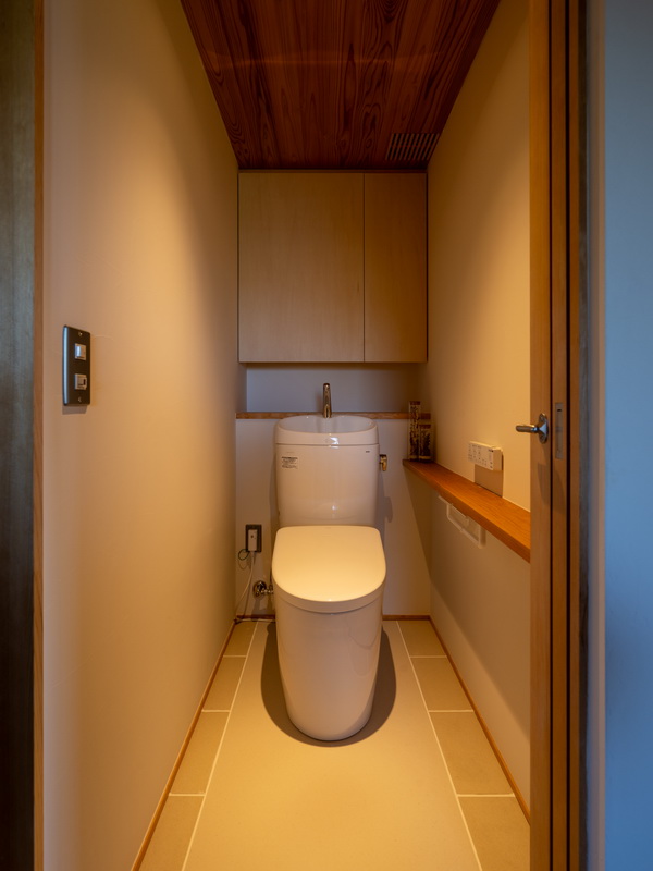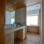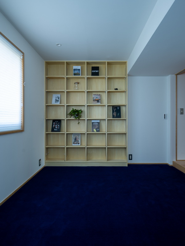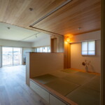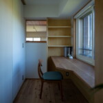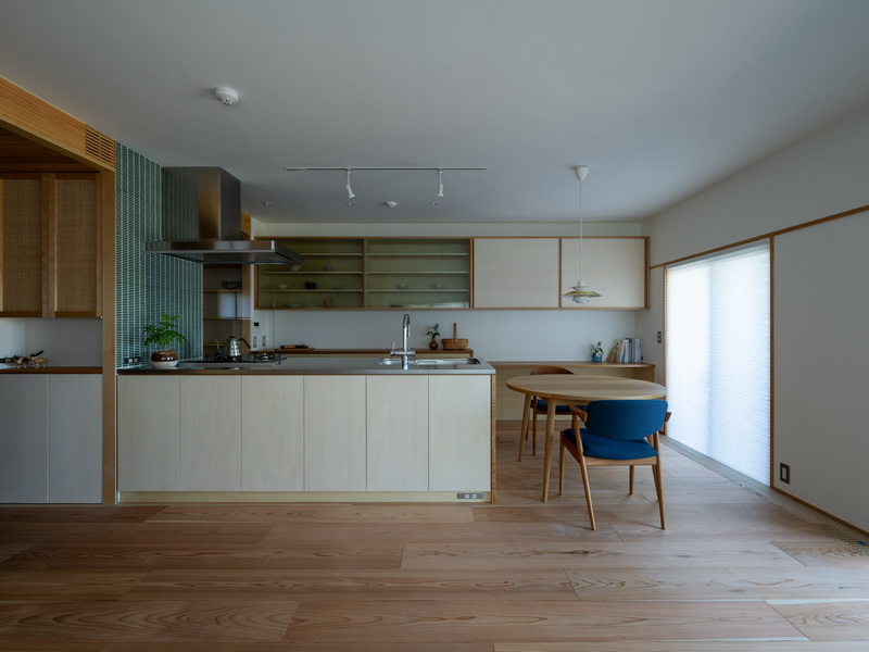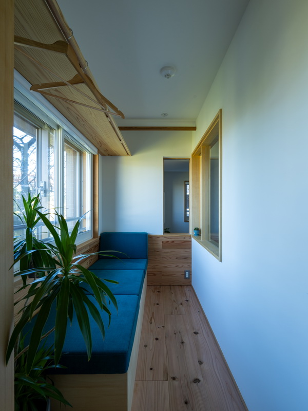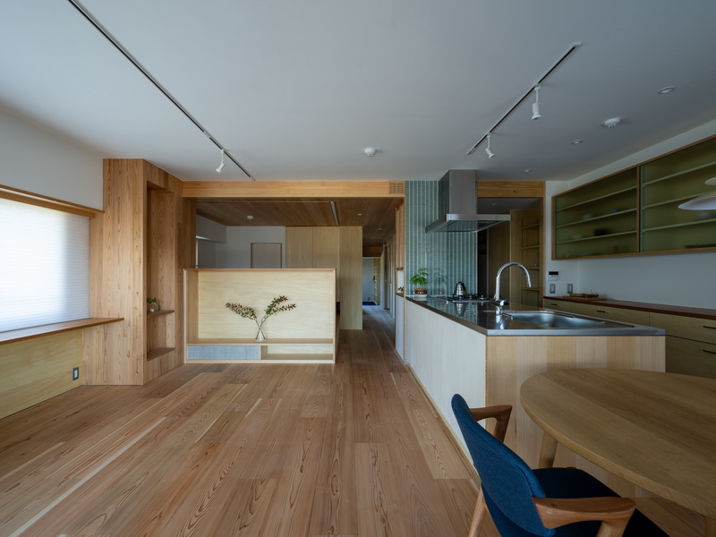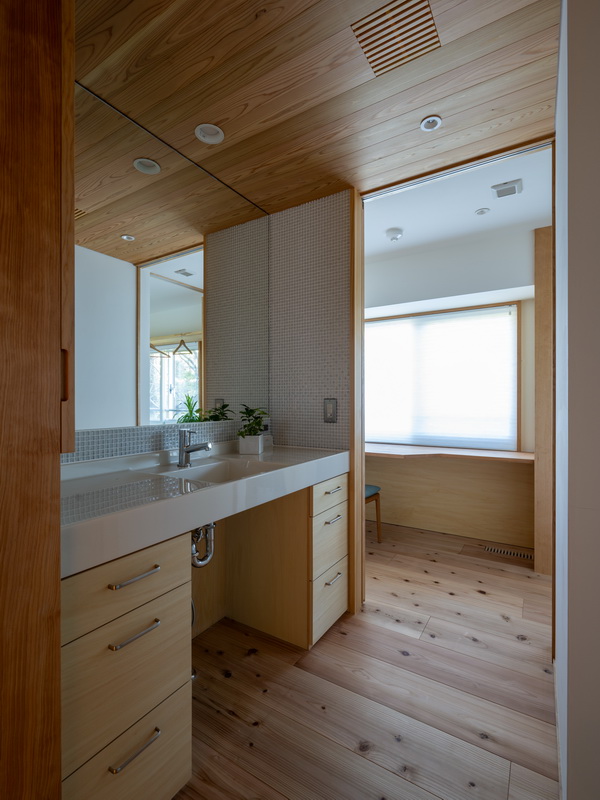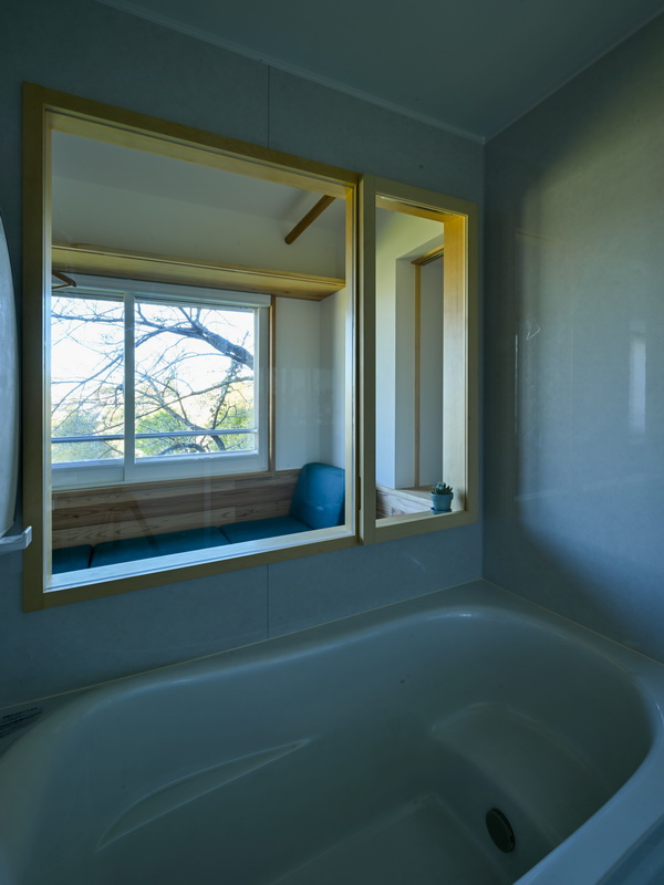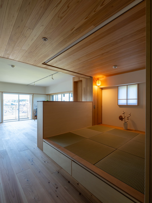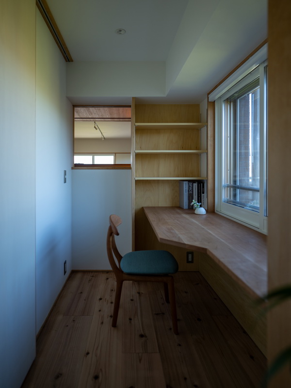 窓から見える街並みやマンション敷地に立つ桜を眺めることができる窓には物干しも兼ねたヌックスペース越しに浴室を配置、窓辺の書斎からも遠景を望むことができる。小上がりの畳スペースとリビングの仕切りのテレビボードは双方とも可動式として将来的な可変性を持たせている。