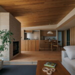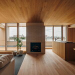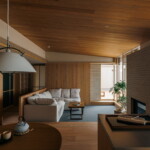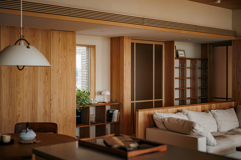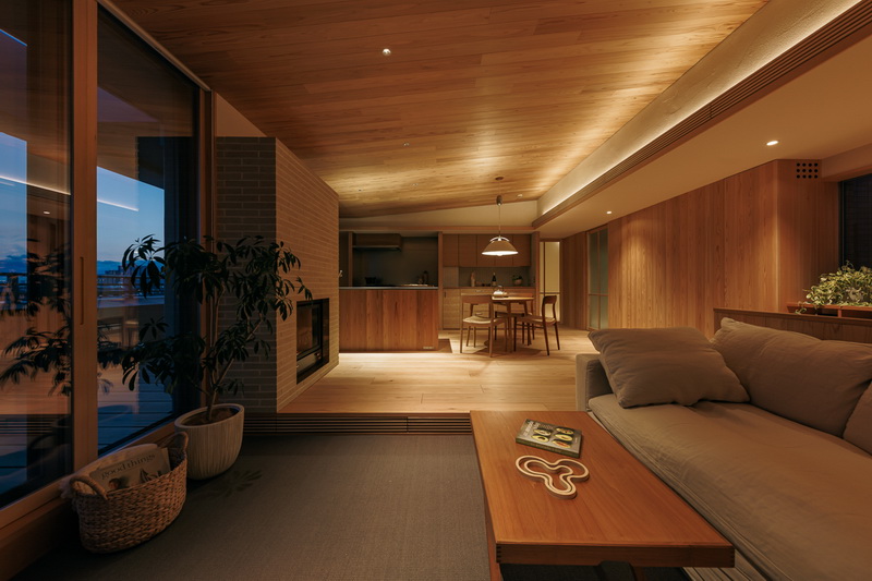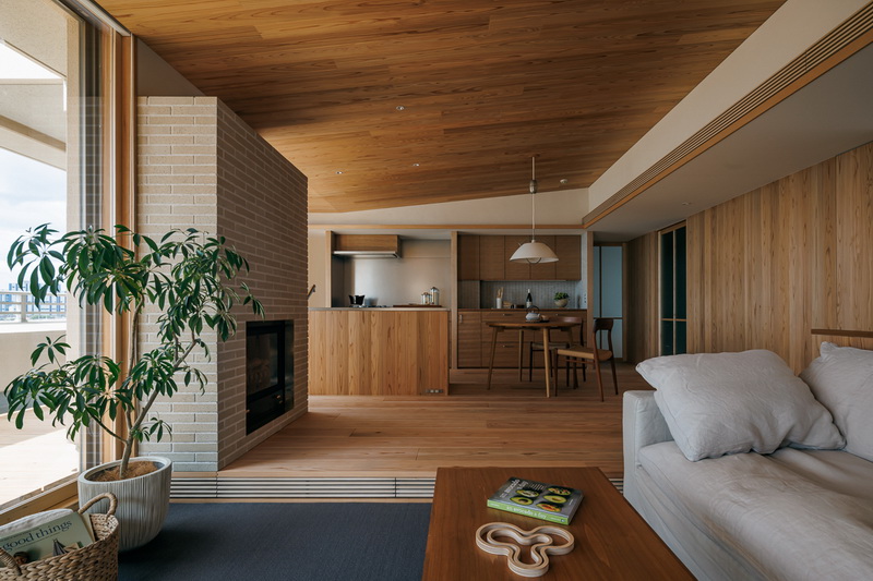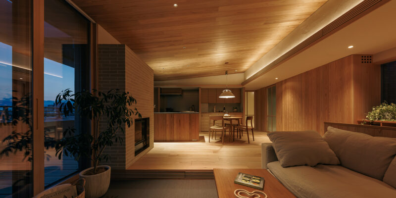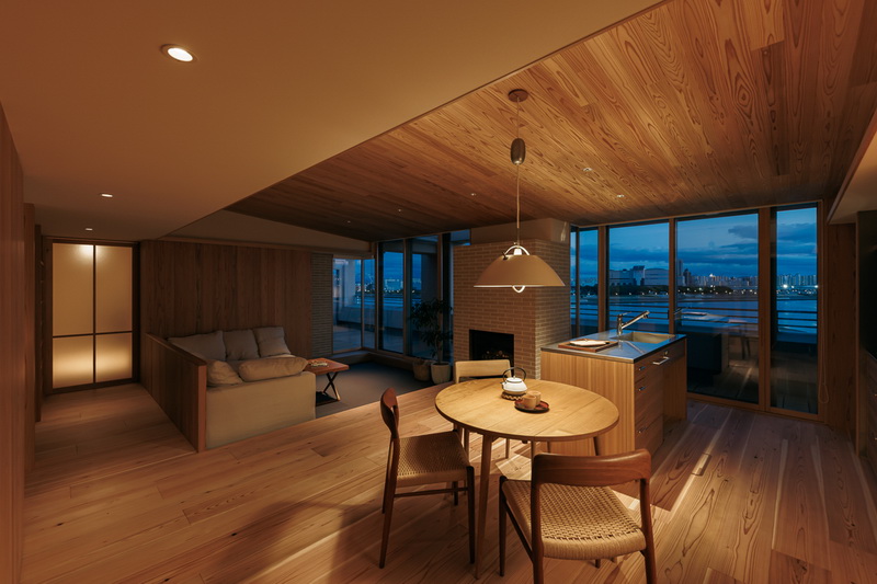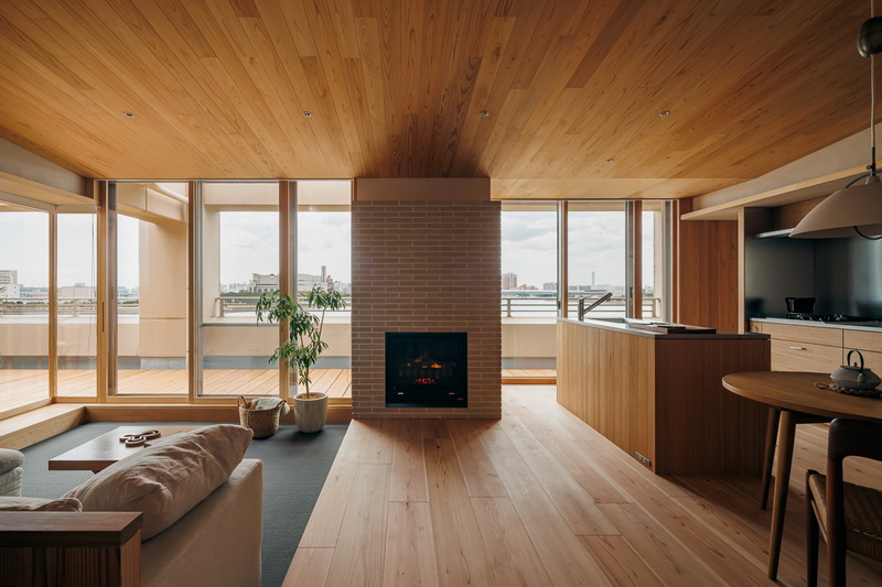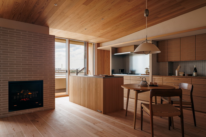 冷暖房はエアコン一台での全室空調システムのほか、クライアントの強い要望でリビングにガス暖炉を設置。最上階のため天井にもウッドファイバーを200ミリ設け、温熱環境も大幅に改善したリゾート感あふれる住まいとなっている。