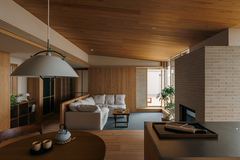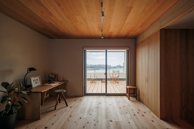 ルーフバルコニーに面したリビングは一段下がったカーペット敷きとし、バルコニーのウッドデッキに繋がる開口部は木製建具で断熱性を確保している。天井は杉材を勾配を持たせて貼り、開口部に向けて高さを絞ることで視線がスムーズに外に向かうよう配慮している。