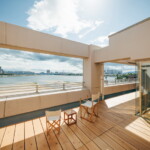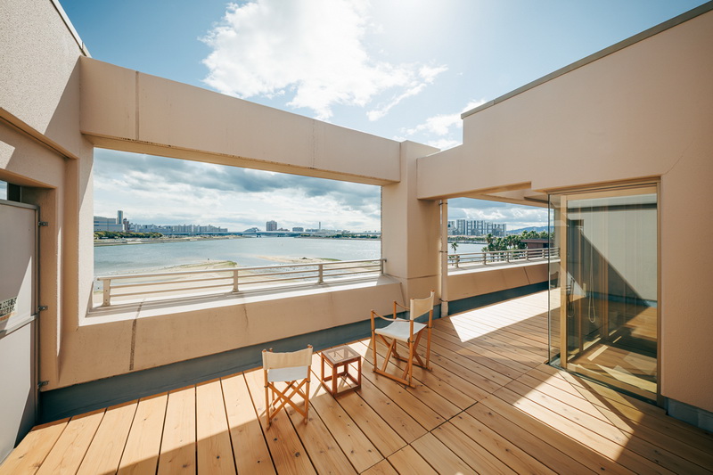 目の前に御前浜の砂浜が広がる、大きなルーフバルコニーを持つマンションのリノベーション。この景観とバルコニーをどう生かすかがポイントとなった。